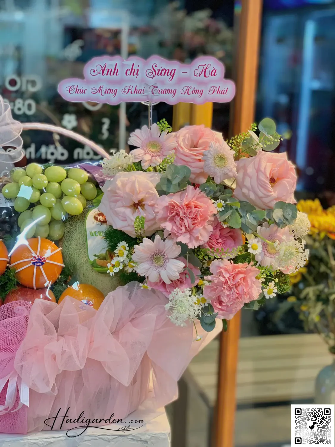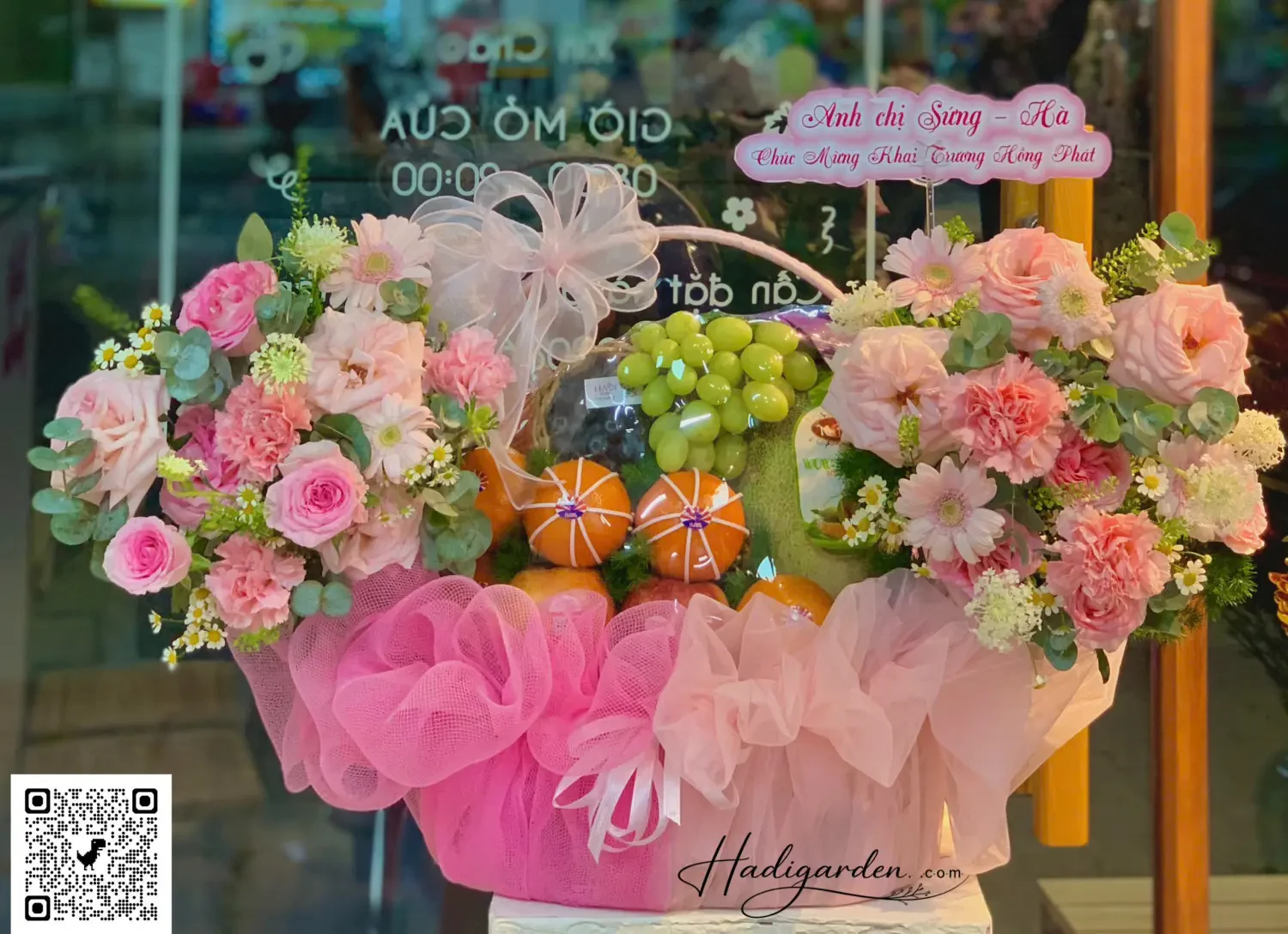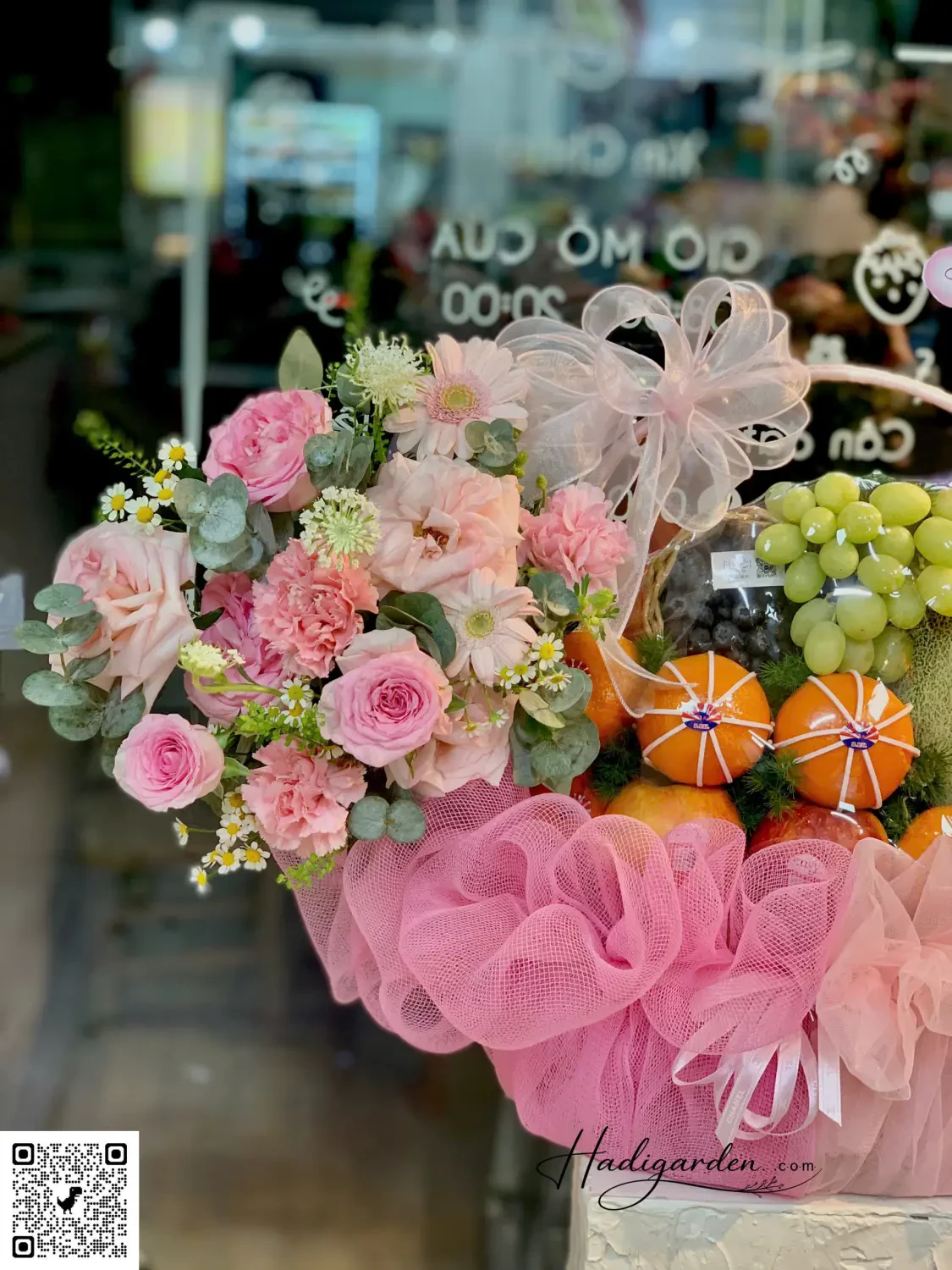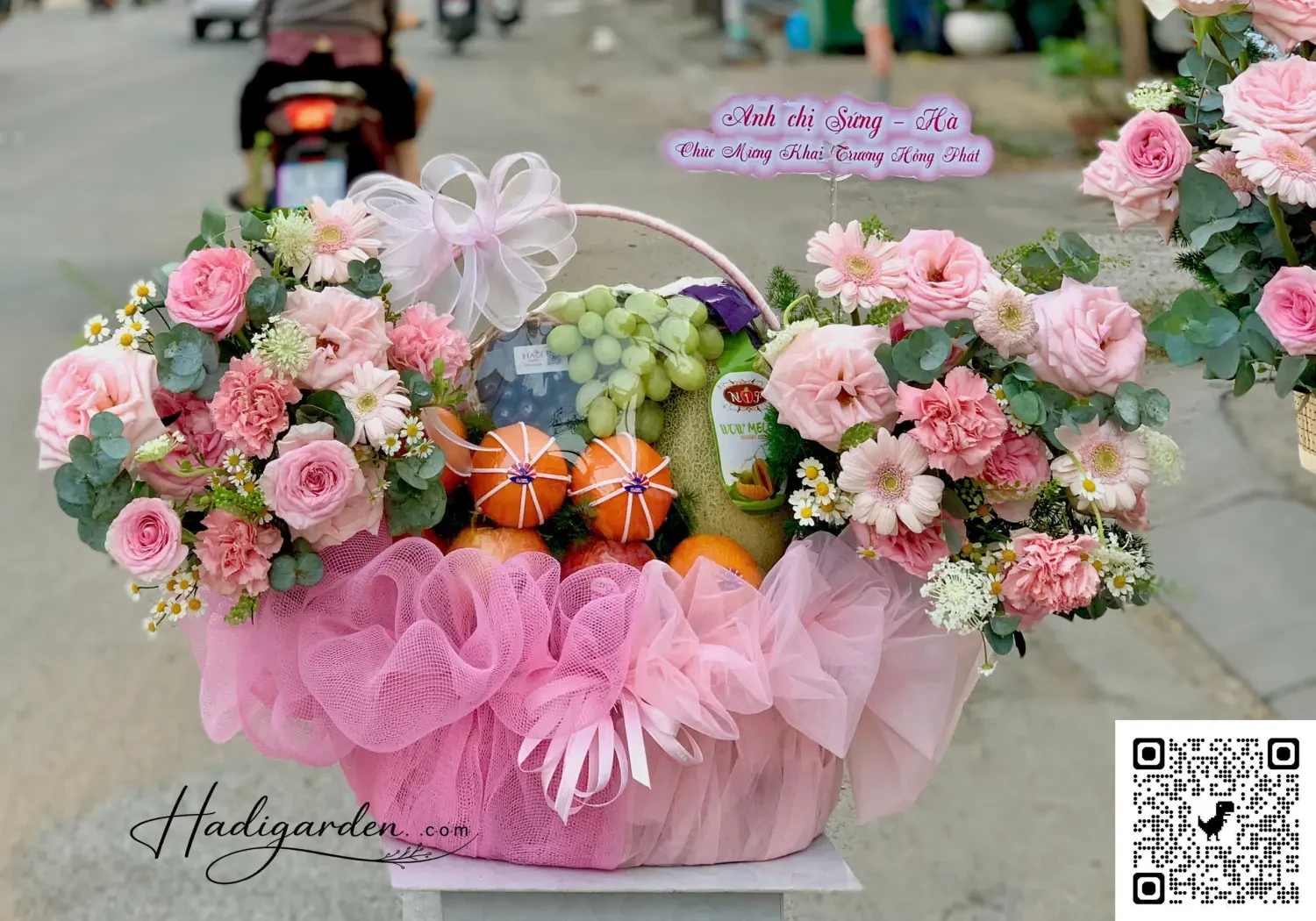 07042502 - Giỏ trái cây mix hoa tone hồng sang trọng, hiện đại full 2 mặt trước sau