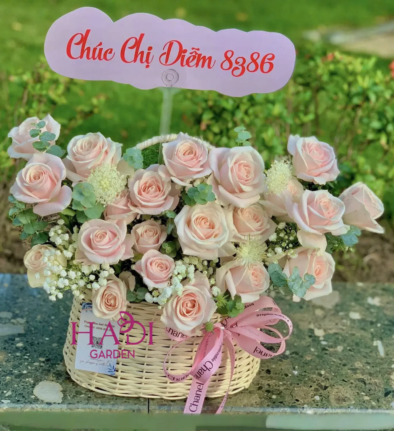 Giỏ hoa hồng kem với thiết kế tinh tế, thích hợp cho khai trương, tân gia, sinh nhật. Đặt ngay tại hadigarden.com.