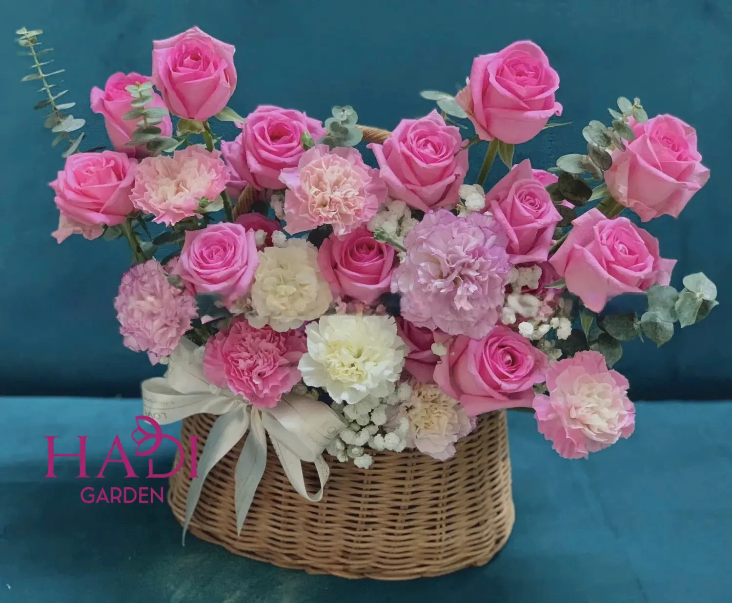 - Vẻ đẹp đến từ sự kết hợp hoàn hảo: Giỏ hoa là sự hòa quyện của nhiều sắc thái hoa hồng khác nhau, từ hồng pastel nhẹ nhàng đến hồng đậm quyến rũ, cùng với vẻ đẹp e ấp của hoa baby's breath trắng tinh khôi và nét duyên dáng của cẩm chướng. Tất cả tạo nên một giỏ hoa vừa ngọt ngào, vừa sang trọng.
