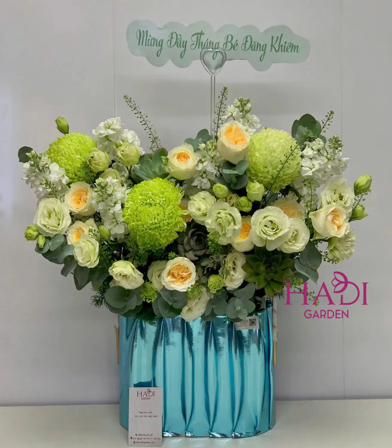 Giỏ hoa tone xanh bơ mát dịu